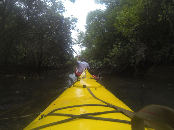 Wir packen Nigels Kayaks kurz aufs Auto und sind knappe 10 Minuten später schon in der Mission Bay und fahren einfach landein- bzw stromaufwärts durch die Mangroven bis wir wegen der einsetzenden Ebbe in den flachen Ausläufern aufsetzen und lassen uns zurück treiben. Not too bad for inner city kayaking.