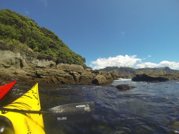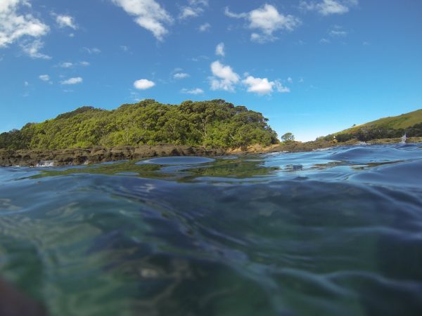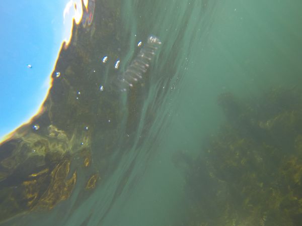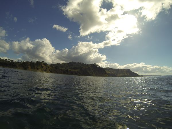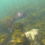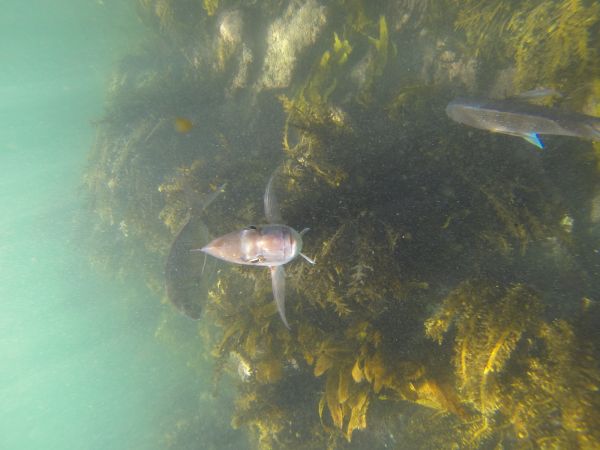 Wir haben die Kayaks am Start, erst umrunden wir die Insel, danach schnorcheln wir im Kelp. Die Sonne brennt, das Wasser des Südpazifiks hat ca 20 Grad, die Sichtweite unter Wasser ist mit ungefähr 12 Metern prima. Wir sehen viele Snapper, einen riesigen Crayfish und Rochen, die ganze Gegend ist Naturschutzgebiet und die Tiere sind einfach mal gar nicht scheu.