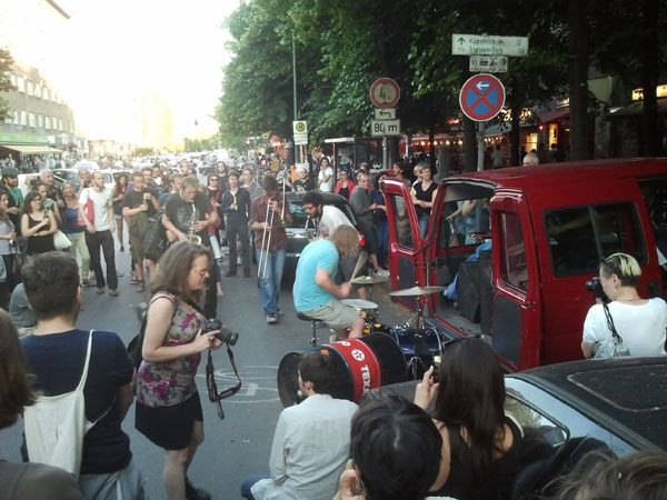Jedes Jahr am 21.6. wird in ganz Europa draussen umsonst musiziert. Aus unerklärlichen Gründen war dieses Jahr in Krzbrg elektrisch verstärkte Musik verboten(?). Ein sehr unsportlicher Vorstoss der Stadtverwaltung. Dachte sich auch diese mobile Free-Jazz-Noise-Terror-Combo, die an verschiedensten Orten sehr wilde 10-Minuten-Guerilla-Gigs spielte.
