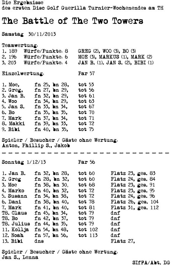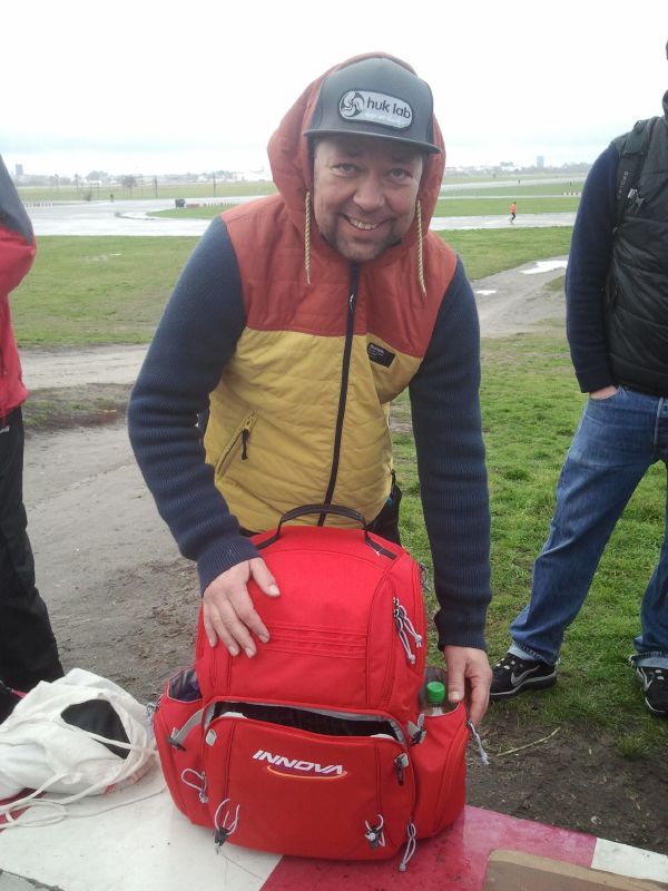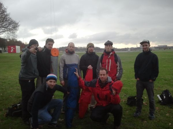 Das Geburstagskind, Filmemacher und aktiver Flugscheibenhistoriker Jan B. hatte am letzten Wochenende zum ersten Guerilla Disc Golf Turnier auf dem Tempelhofer Feld geladen. Samstag wurde in einem Team-Battle-Modus mit Einzelwertung und Gesamtscore geworfen, Sonntag dann die Singles. Das Wetter war schon ganz schön novembrig, hätte in dieser westsibirischsten Stadt der Welt aber bestimmt locker noch krasser ausfallen können. Der prima Kurs ist mit schicken Objekten und ein paar mobilen Körben präpariert, der exklusive Spass ist trotz des starken Winds und der insgesamten Nieseligkeit sehr gross.
