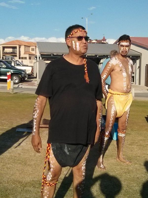 Die Gruppe führt traditionelle Tänze auf, während der Häuptling Percussion und Didgeridoo spielt. Hypnotisch.