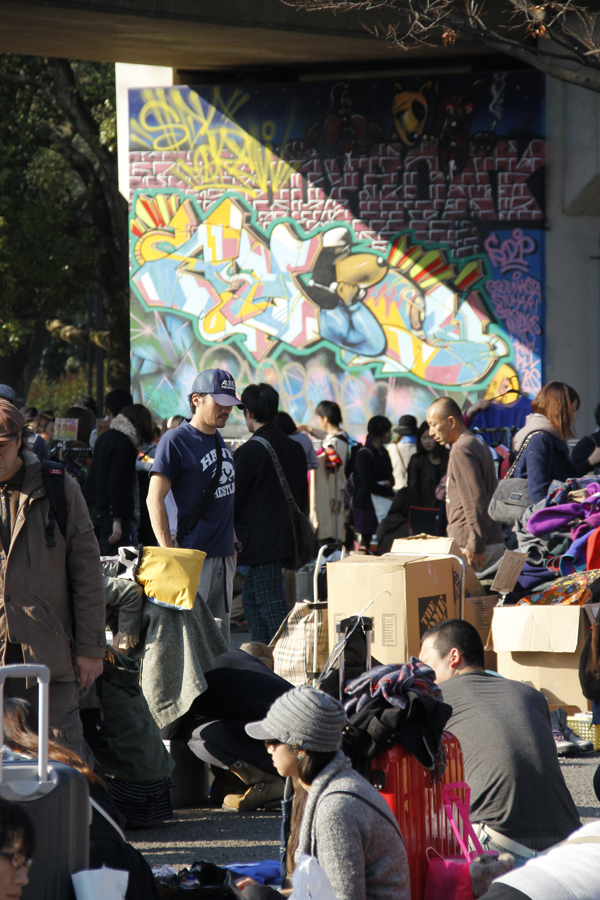 Am Sonntag waren wir noch mal in Harajuku unterwegs und sind auf einem Flohmarkt gelandet. Das wäre bei uns wohl komplett normal und nicht erwähneswert, anders als in Japan. Das Prinzip „gebraucht kaufen“ ist in Japan eigentlich eher unbekannt. Auf dem Flohmarkt gab es auch noch japanische Bratwürste, auf Chopsticks aufgespiesst, Steckerlwurst sozusagen.