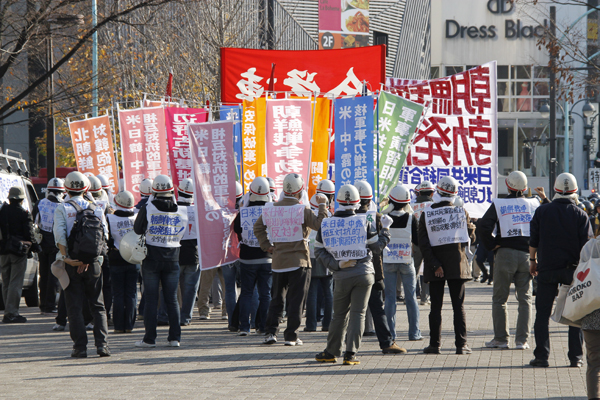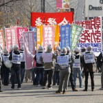 Gleich nebenan war noch eine Demo, wofür oder wogegen liess sich einfach und auch schwierig nicht herausfinden, aber es wurden inbrünstigst laute Slogans skandiert. Eine Demo in Japan ist ansonsten wie bei uns, ca 50 Demonstranten und das fünf- bis zehnfache an Cops.