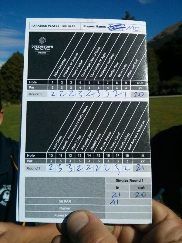 Simon Feasey und myself spielen die dreieinhalbstündige Doubles-Runde auf dem 18-Bahnen-Kurs mit dem Team Nik Eisel aus Hannover und Chris Davies aus ChCh. Wir rrrrocken den Par-56-Kurs komfortabel mit einer 39 und landen vor Brad und Woody (42 Würfe) und Nik-Chris auf dem ersten Platz.