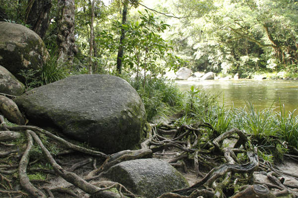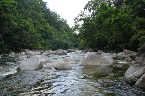 Mossman Gorge ist eine schicke Schlucht im Regenwald, der Mossman River fliesst mit relativ starker Strömung durch haufenweise abgeschliffene Felsen. Das Schwimmen darin ist super erfrischend, ein echt wohltuender Kontrast zu der krassen Hitze und der unglaublichen Luftfeuchtigkeit.