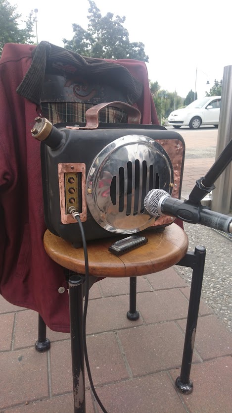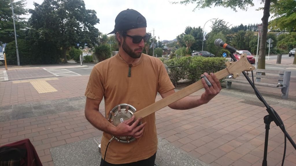 Strassenmusiker mit DIY-Banjo und Verstärker