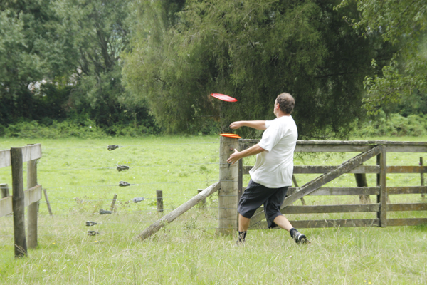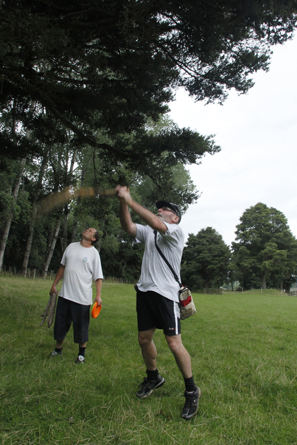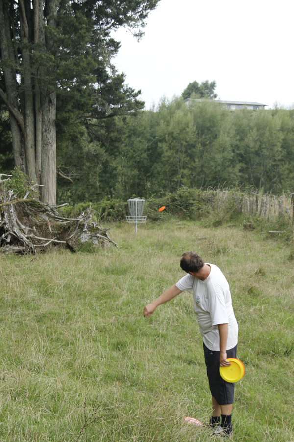 Der riesige 18 Loch Kurs liegt ungefähr fünf Minuten mit dem Auto von Petes Haus in Taumarunui entfernt. Ich spiele den Kurs zusammen mit Pete und Blair, die ich auf den New Zealand Disc Golf Championships kennengelernt habe. Blair ist gerade NZ Masters Champion geworden, Pete Vizemeister bei den Grandmasters. Die beiden rocken unglaublich. Der Kurs ist ganz schön schön und auch ziemlicher Hardcore. Die Bahnen sind zwischen 60 und 180 Meter lang, vier Bahnen sind länger als 160 Meter. Alles ist Par 3, Schafe, Wasser und alles hinter Zäunen ist OB, es gibt ausserdem Mandos und Doglegs. Ich bin mit +4 happy, Pete spielt +2 und Blair +1. Hell Yeah!