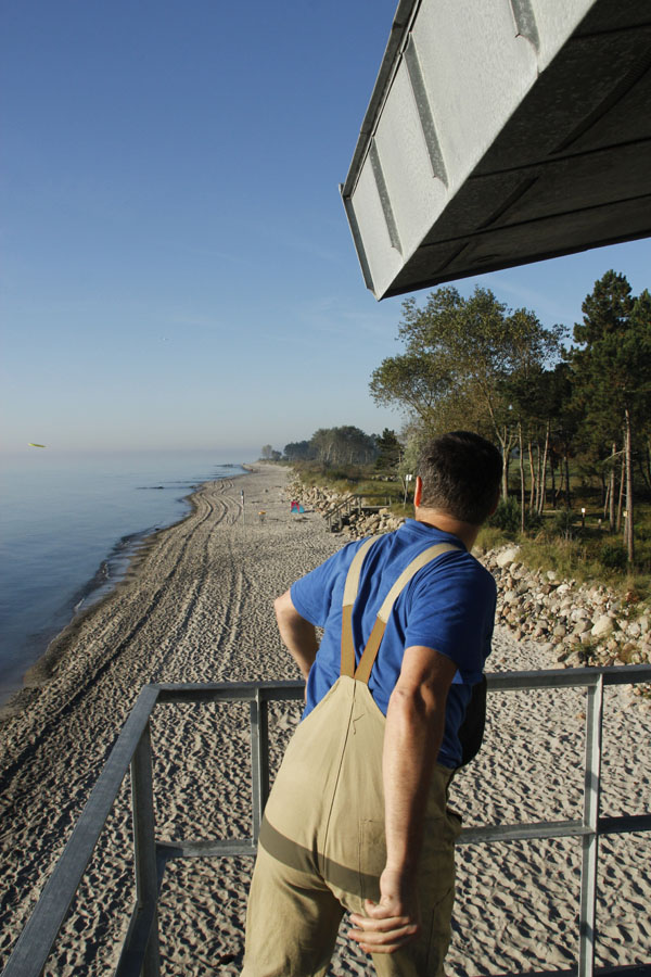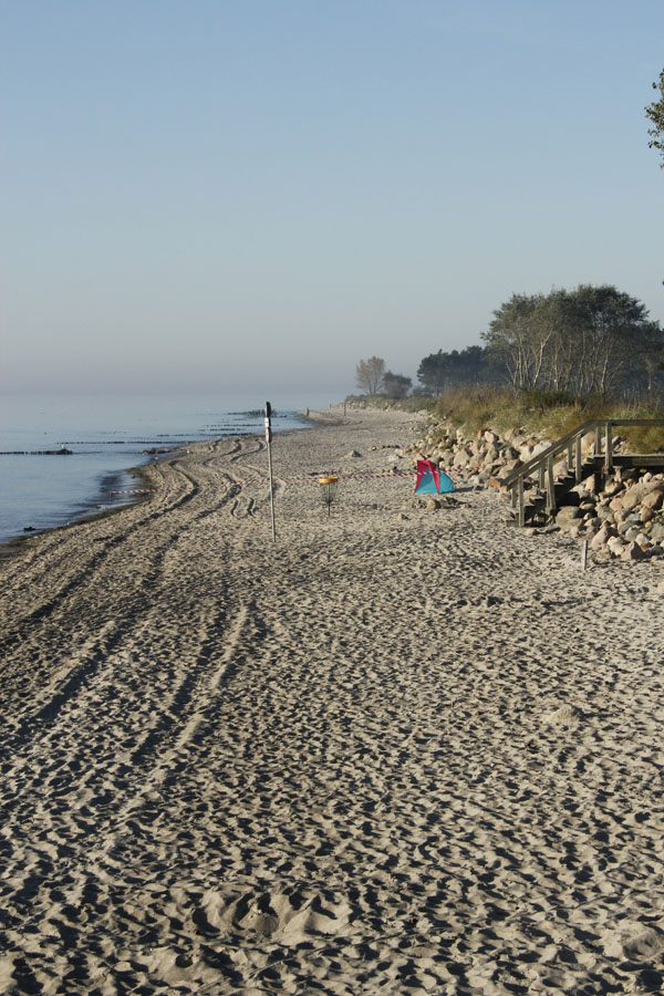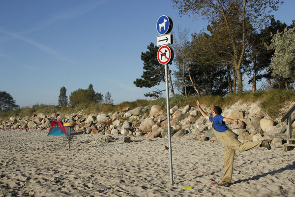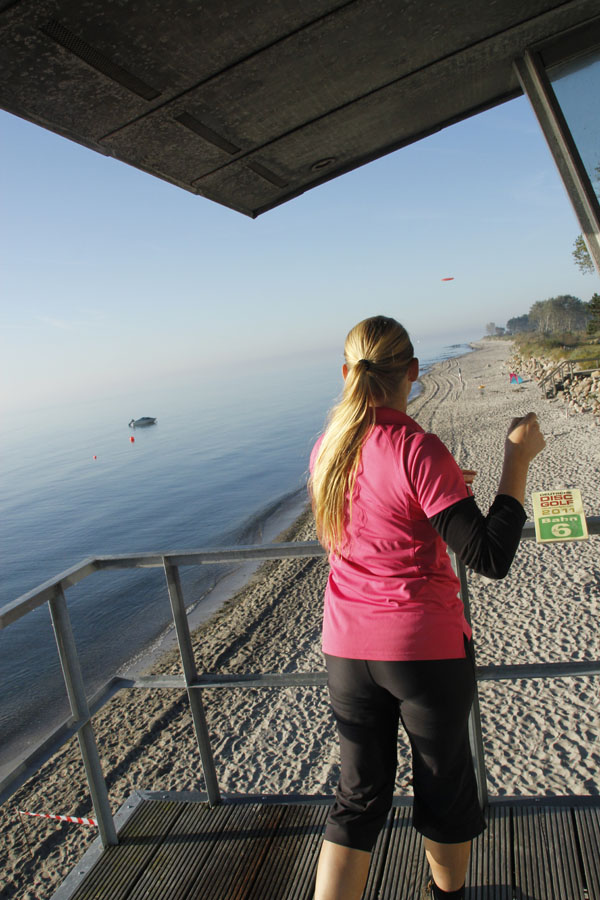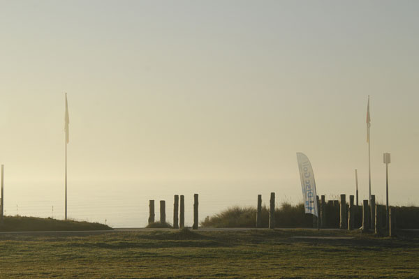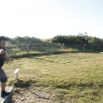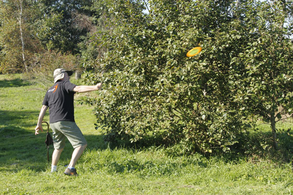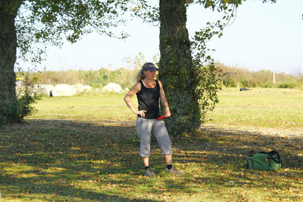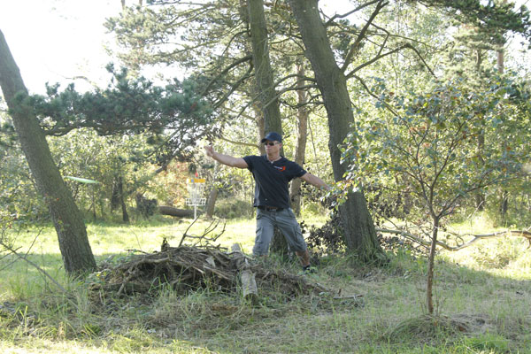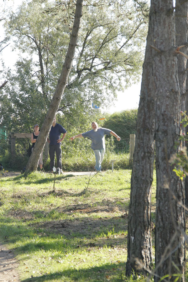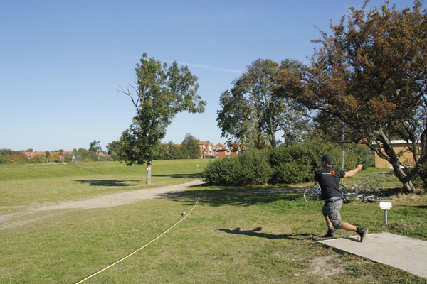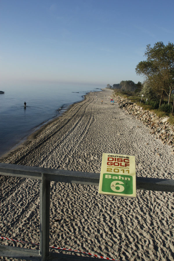 Der Kurs ist auf den Wiesen und Waldstücken zwischen Deich und Strand angelegt, für die DM von 22 auf 21 Bahnen verkürzt und bietet ausser grossen Höhenunterschieden so ziemlich von Allem etwas. Trickreiche kurze Bahnen mit Doglegs und Mandos, tückische OBs, laaange Bahnen auf offenen Flächen und Waldbahnen mit sehr wenig verzeihenden, je nach Gattung superklebrigen und teilweise fast unsichtbaren Ästen. Schick. Je nach Länge sind die Löcher Par 3 oder 4, das Kurspar liegt bei 63 Zählern.