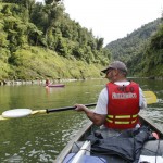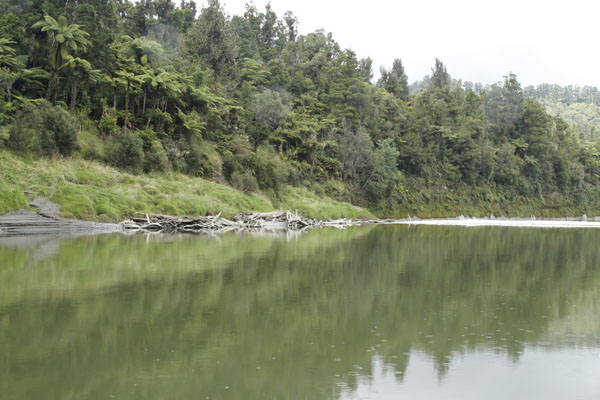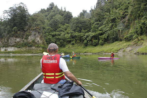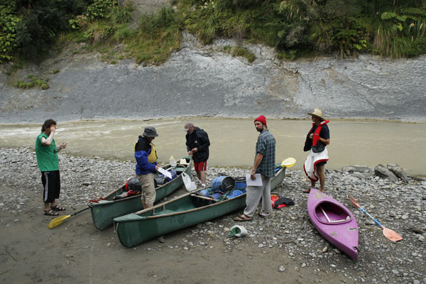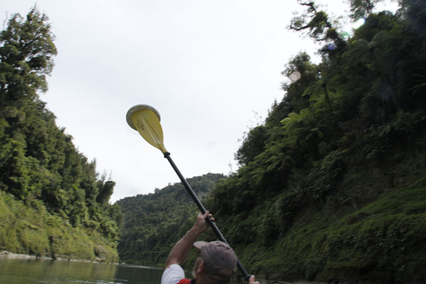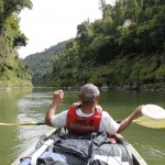 Der nächste Tag ist etwas arg regnerisch, der Unterschied zwischen Fluss und Luft lässt sich kaum mehr feststellen. Zum Glück wird es nicht richtig kalt, nass sind wir ja sowieso schon. Wir lassen den geplanten Landgang an der Bridge to Nowhere wegen Regen sausen und paddeln weiter. Jedenfalls freuen wir uns spätnachmittags wirklich über den trockenen Schlafplatz in der Tieke Kainga Hütte und noch mehr über Corynnes vorgekochtes, eingefrorenes und mitgebrachtes Essen. Diese wird von John aus Jerusalem betrieben, der einen wirklich sehr eigenartigen Slang spricht, selbst die Kiwis haben einige Probleme, sich mit ihm zu verständigen oder aufs richtige Thema zu einigen.
