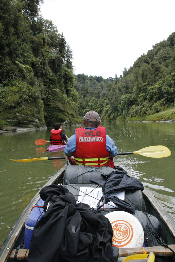 Jörg, Moni, (young) Earnest, Pete und ich haben eine dreitägige Kanutour auf dem eher gemächlichen, aber doch mächtigen und sehr schicken Whanganui River gemacht. Wir werden von Chris bei Whakahoro am Retaruke River abgesetzt und machen uns bei gutem Wetter auf den angenehmen Weg. Die erste Teilstrecke bis zur John Coull Hut ist einfach nur prima. Die Extreme Frisbee Labs werden ums Canoe River Ultimate bereichert, Fluss, Frisbee und angenehmste Gesellschaft machen einfach richtig Spass. Irgendwann und trotzdem nebenbei stehen Jörg und ich nachmittags kurz vor der Gründung der Little River Revival Band, wenn wir uns doch wenigstens nur an einen ihrer Hits erinnern könnten.