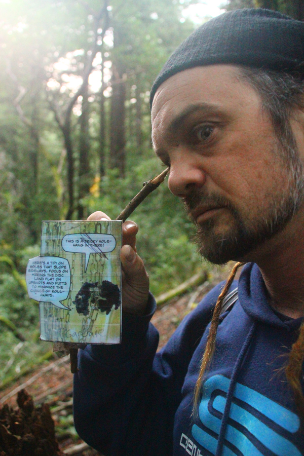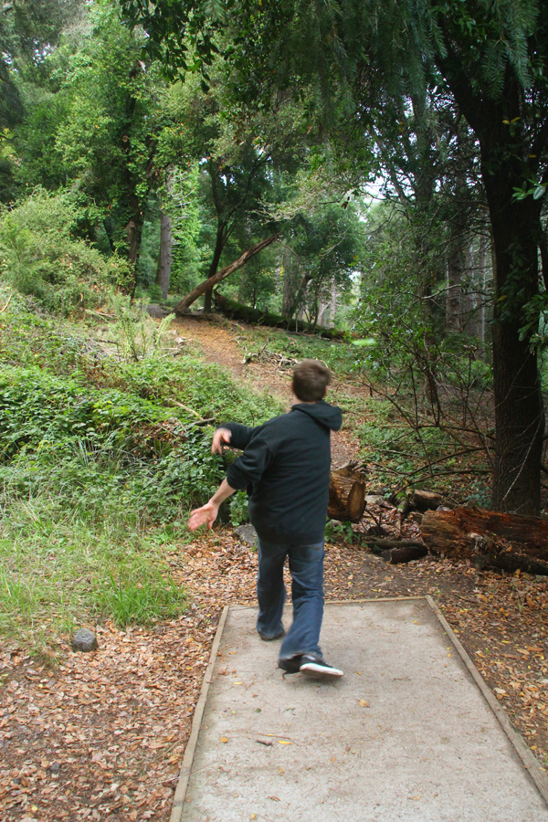 Felton liegt in der Nähe von Santa Cruz, es gibt dort einen Disc Golf Parcours mit 18 Bahnen, ich war am 11.11. da. Das Kursdesign ist supertechnisch, es gibt ganz enge Gassen, steile Abhänge, genauso aber auch wieder steil bergauf. Die Körbe sind fast alle so positioniert, dass man sie am Tee nicht sehen kann. Hollabolla. Die Bahnen sind relativ kurz, zwischen 50 und 80 Meter, nur zwei sind länger als 100 Meter. „It´s all about discipline“, sagt Nate. Trotzdem spielen wir eine sehr lustige Runde.