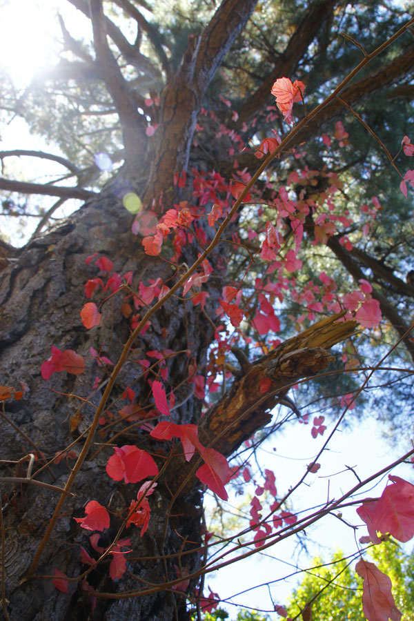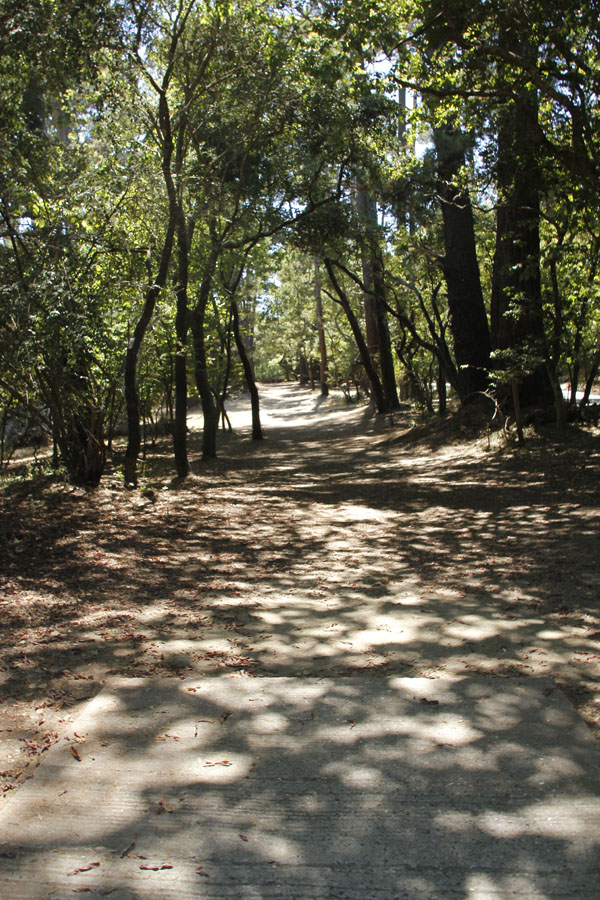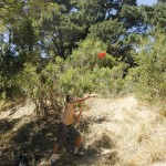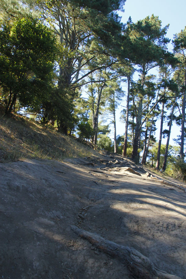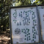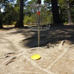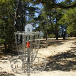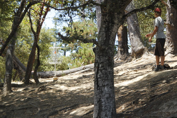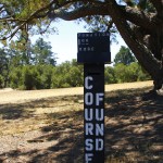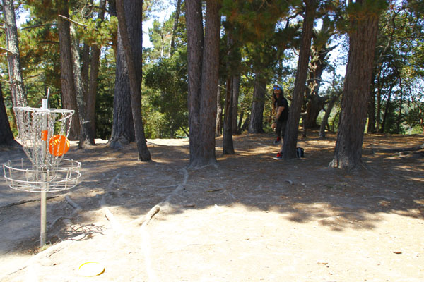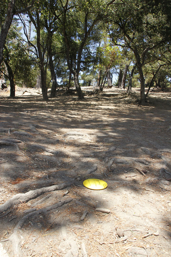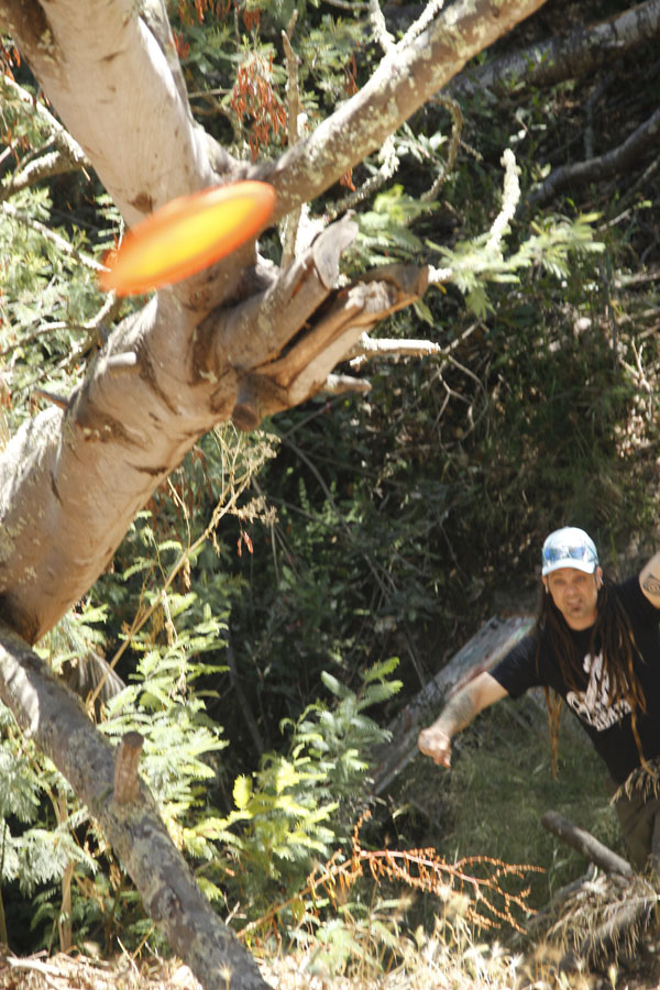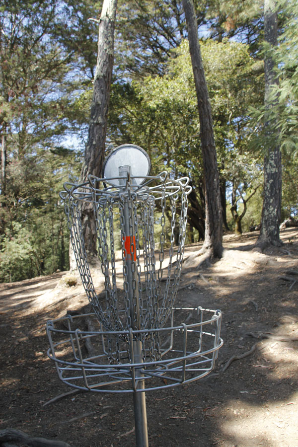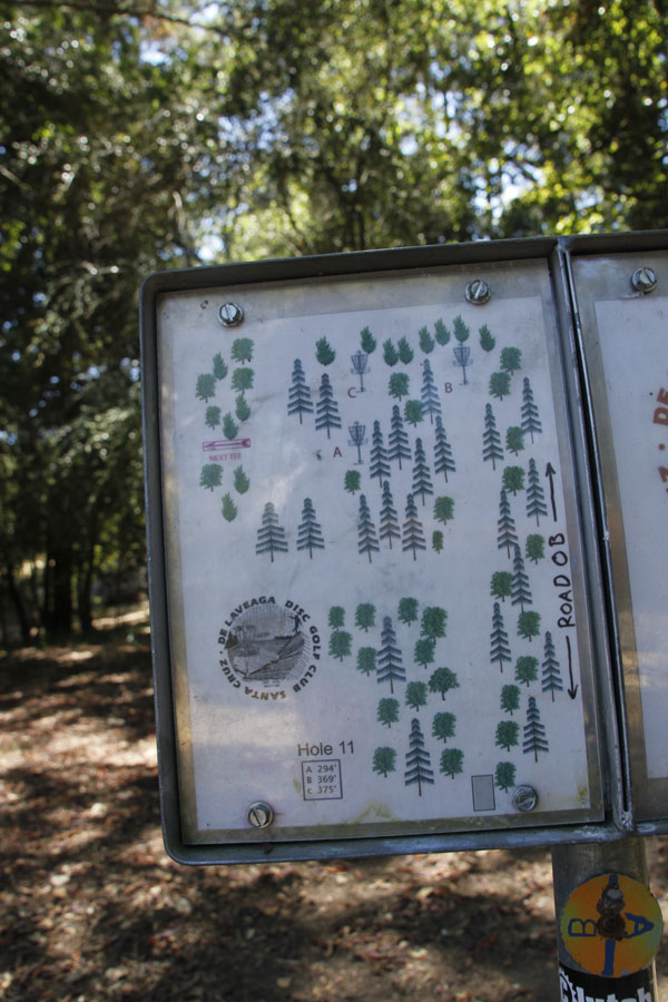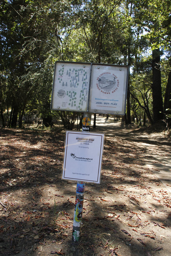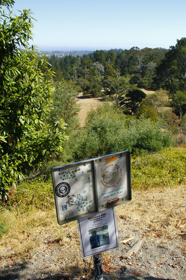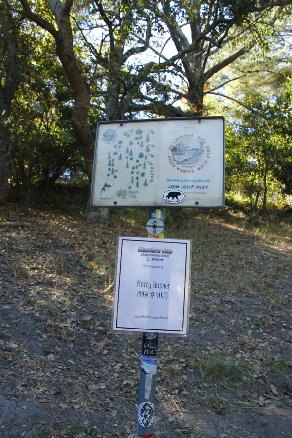 Der Megaparcours hat 27 Bahnen, alle Pole-holes werden Par 3 gezählt. Natürlich gibt es Mandos, OBs, riesige Redwood-Bäume, Abhänge, schräge Ebenen, Höhenunterschiede, schier endlos lange Bahnen und tricky positionierte Körbe galore. Das echt ätzende Poison Oak hat sich hier schillernd rot verfärbt und lässt sich gut erkennen und auch vermeiden.