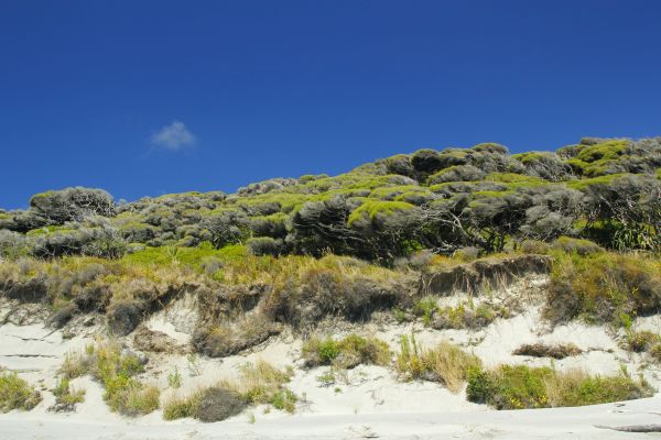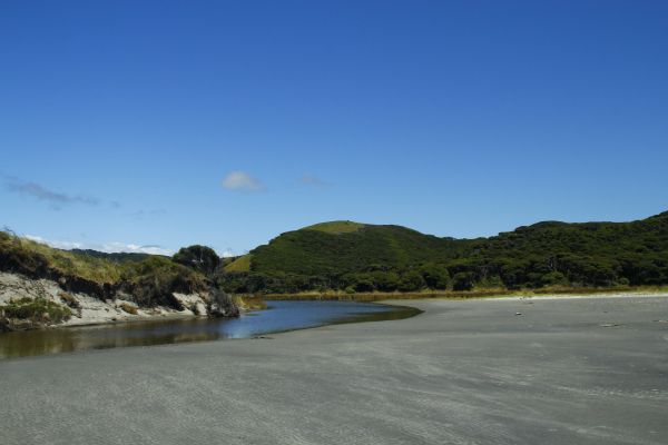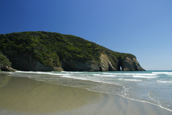 Der komplett menschenleere Green Hill Beach ist nur ein paar Kilometer zu Fuss über die Hügel von Wharariki entfernt und genauso magisch.